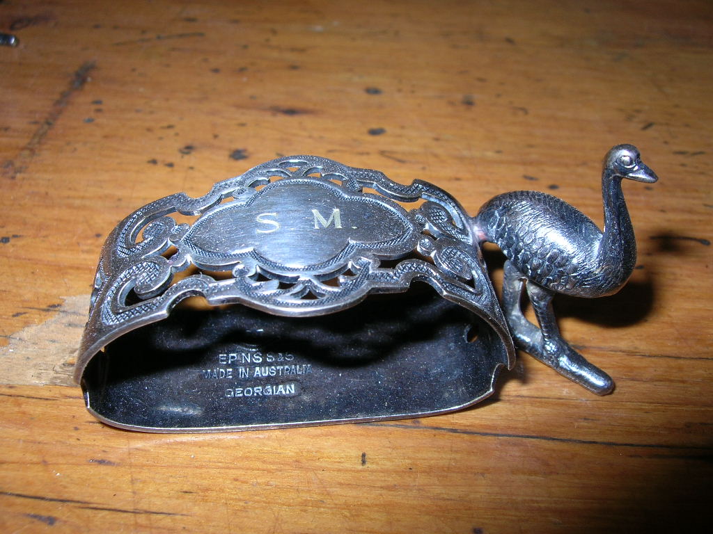 Australian napkin ring on leaf base with emu, marked EPNS S&S