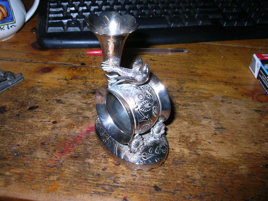 is a magnificent figural napkin ring with a bud vase. It an unusual