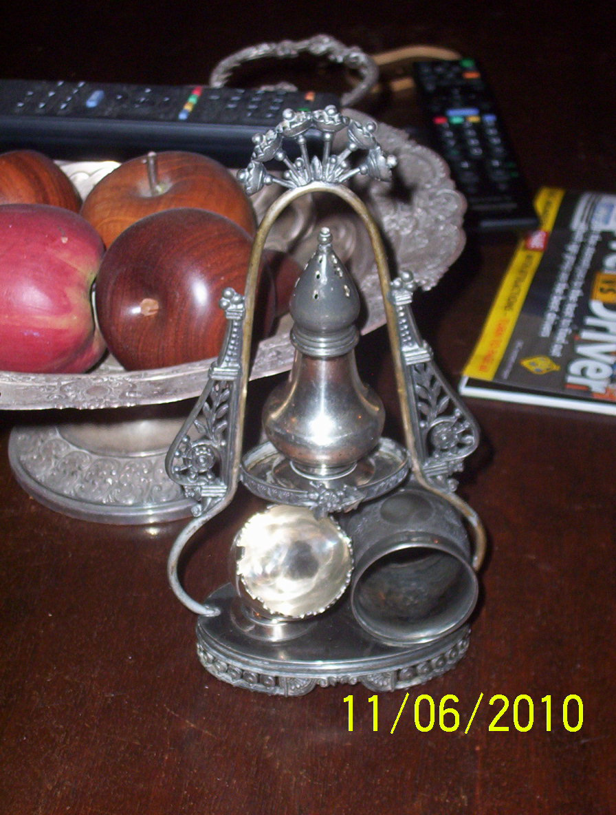 handle scrolls salt bowl, pepper pot and a vinigar bottle.