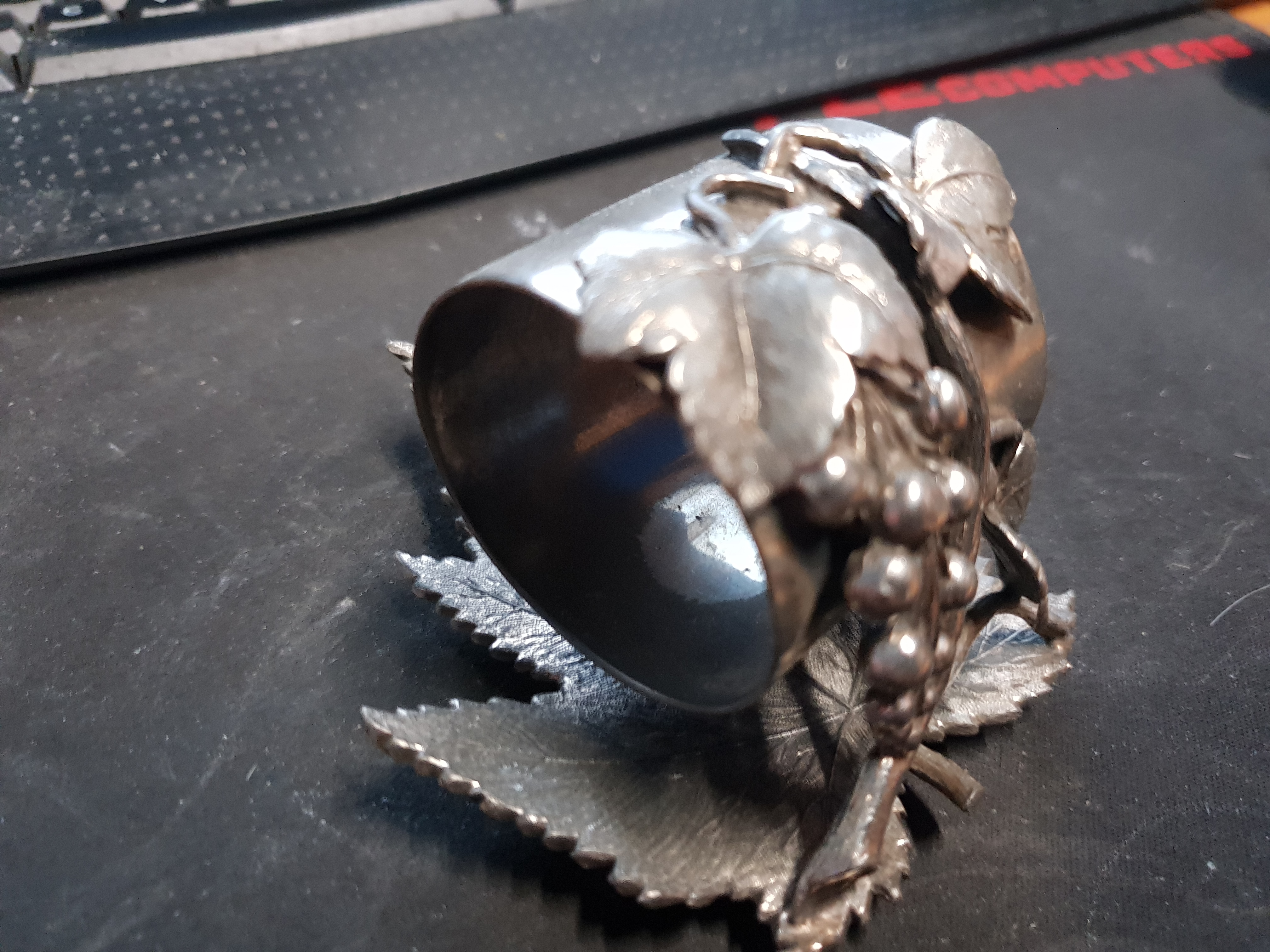 detail engraved napkin ring with berry and leaf, unmarked