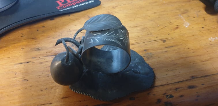3 x napkin ring with hammered arts and crafts finish with fruit (pear?)